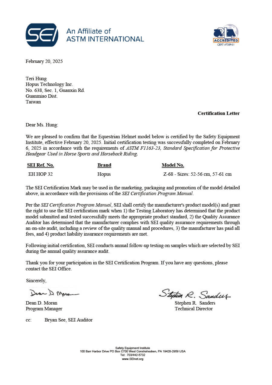 – Equestrian helmets certified the latest SEI equestrian helmet standard F1163-23.